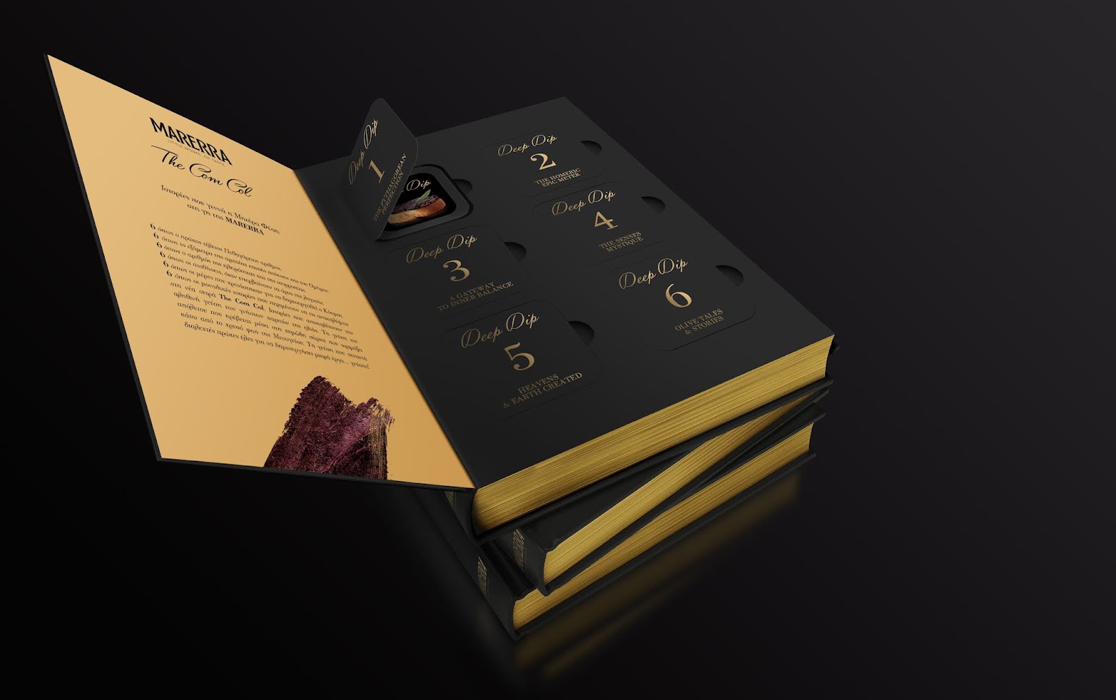 作為一份公司禮品,我們?cè)O(shè)計(jì)了一種書(shū)籍形式的包裝,其中包含六種不同品種的橄欖醬。橄欖醬包裝以橄欖醬精制產(chǎn)品為特色,以服務(wù)建議書(shū)的形式。除了橄欖醬,這本書(shū)還講述了馬雷拉哲學(xué)和優(yōu)質(zhì)橄欖。