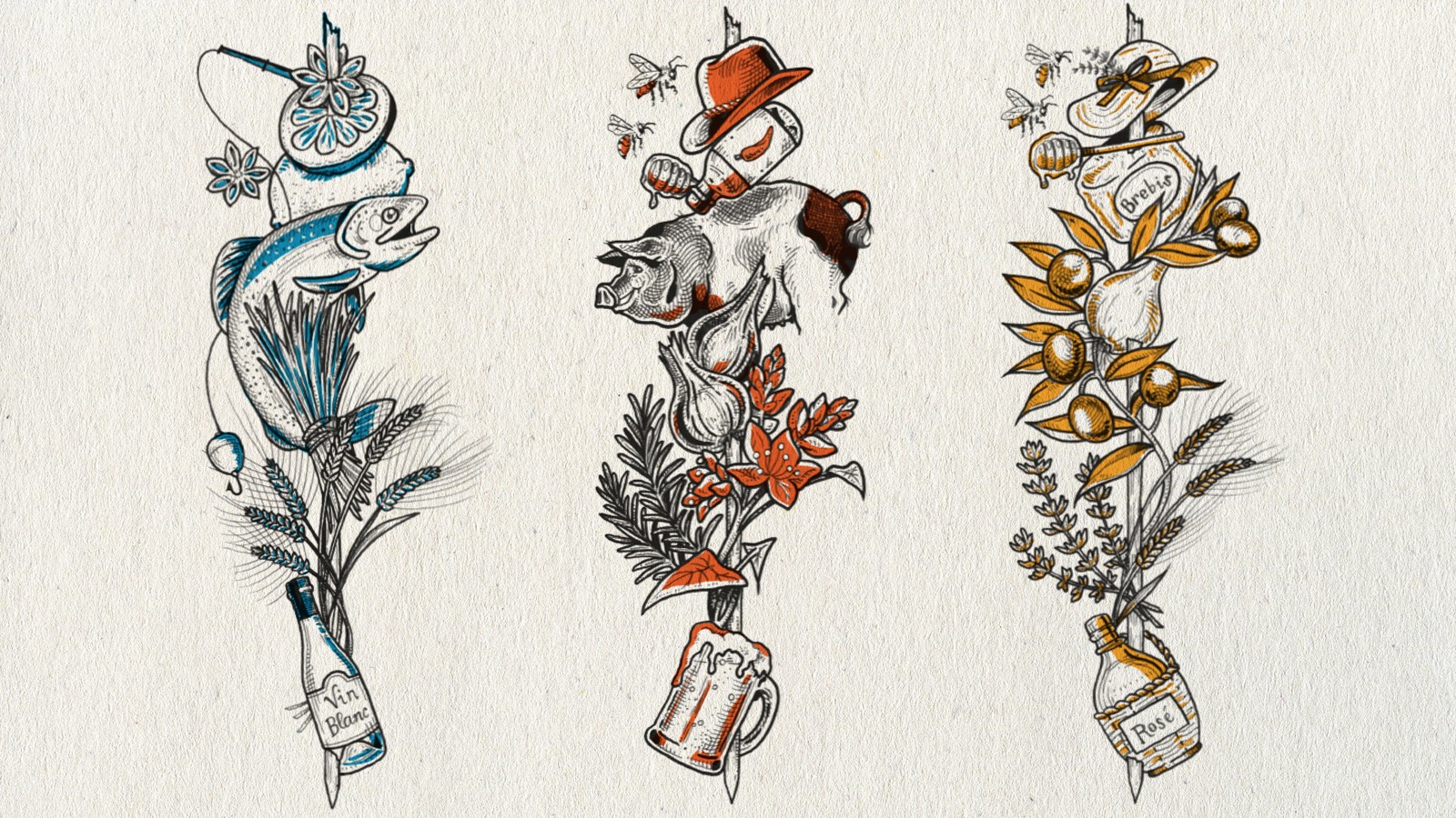 這些盒子分布在葡萄酒商店和熟食店,采用三種傳統(tǒng)設(shè)計(魚,肉和蔬菜)來象征當(dāng)?shù)?。三個圖案,三個精美插圖和“好心情”顏色編碼清晰地呈現(xiàn)了每個設(shè)計和每個互補的風(fēng)味。