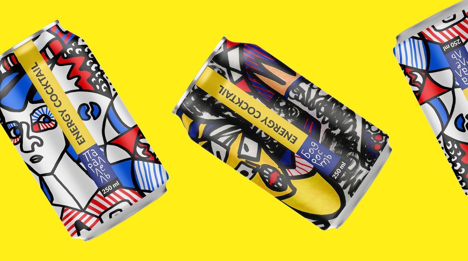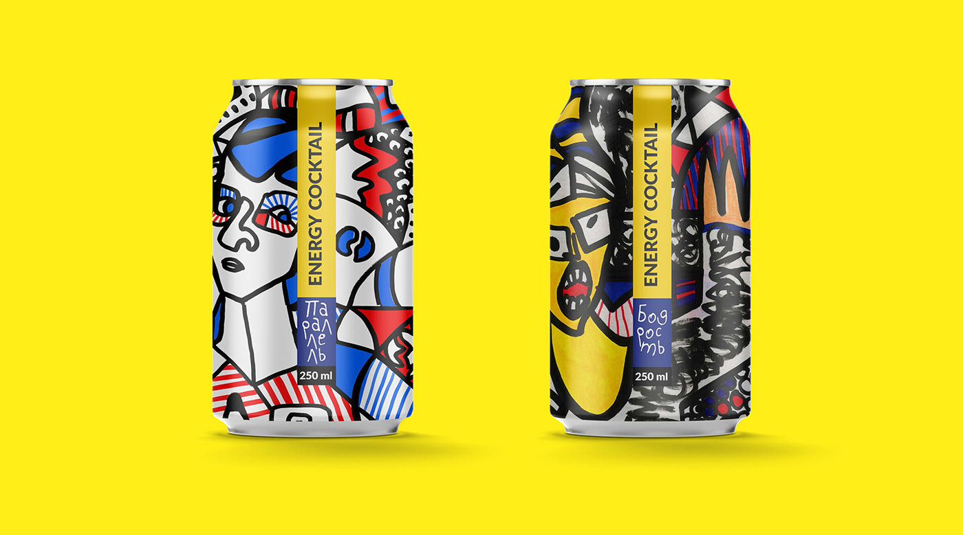 能量雞尾酒:“平行”和“快樂(lè)”。包裝設(shè)計(jì)是基于肖像畫(huà)風(fēng)格的讓-杜布夫和讓-米歇爾巴斯奎特,并強(qiáng)調(diào)能量成分的飲料。