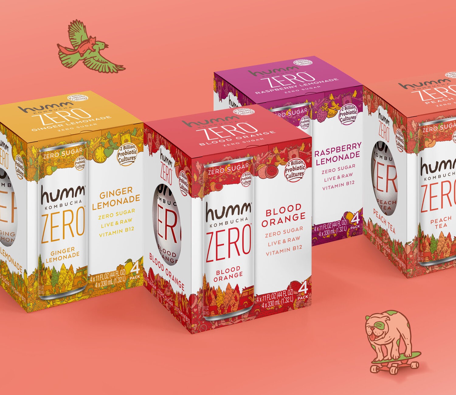 作為原始的和最大的康普茶品牌之一,Humm的彩色標(biāo)簽和主流口味始終吸引著更多的新消費(fèi)者進(jìn)入這一類別。休姆(Humm)不僅依靠他們的成功,還推出了首款零糖紅茶菌,從而再次振興了貨架。零顯然是個(gè)大新聞,但我們的設(shè)計(jì)既精心設(shè)計(jì)了手工制作的徽標(biāo),又設(shè)法保留了該品牌明顯創(chuàng)意和古怪的角色。